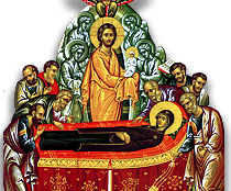 Concerning the Dormition of the Theotokos, this is what the Church has received from ancient times from the tradition of the Fathers. When the time drew nigh that our Savior was well-pleased to take His Mother to Himself, He declared unto her through an Angel that three days hence, He would translate her from this temporal life to eternity and bliss. On hearing this, she went up with haste to the Mount of Olives, where she prayed continuously. Giving thanks to God, she returned to her house and prepared whatever was necessary for her burial. While these things were taking place, clouds caught up the Apostles from the ends of the earth, where each one happened to be preaching, and brought them at once to the house of the Mother of God, who informed them of the cause of their sudden gathering. As a mother, she consoled them in their affliction as was meet, and then raised her hands to Heaven and prayed for the peace of the world. She blessed the Apostles, and, reclining upon her bed with seemliness, gave up her all-holy spirit into the hands of her Son and God. With reverence and many lights, and chanting burial hymns, the Apostles took up that God-receiving body and brought it to the sepulchre, while the Angels from Heaven chanted with them, and sent forth her who is higher than the Cherubim. But one Jew, moved by malice, audaciously stretched forth his hand upon the bed and immediately received from divine judgment the wages of his audacity. Those daring hands were severed by an invisible blow. But when he repented and asked forgiveness, his hands were restored. When they had reached the place called Gethsemane, they buried there with honor the all-immaculate body of the Theotokos, which was the source of Life. But on the third day after the burial, when they were eating together, and raised up the artos (bread) in Jesus' Name, as was their custom, the Theotokos appeared in the air, saying "Rejoice" to them. From this they learned concerning the bodily translation of the Theotokos into the Heavens. These things has the Church received from the traditions of the Fathers, who have composed many hymns out of reverence, to the glory of the Mother of our God (see Oct. 3 and 4). Learn more